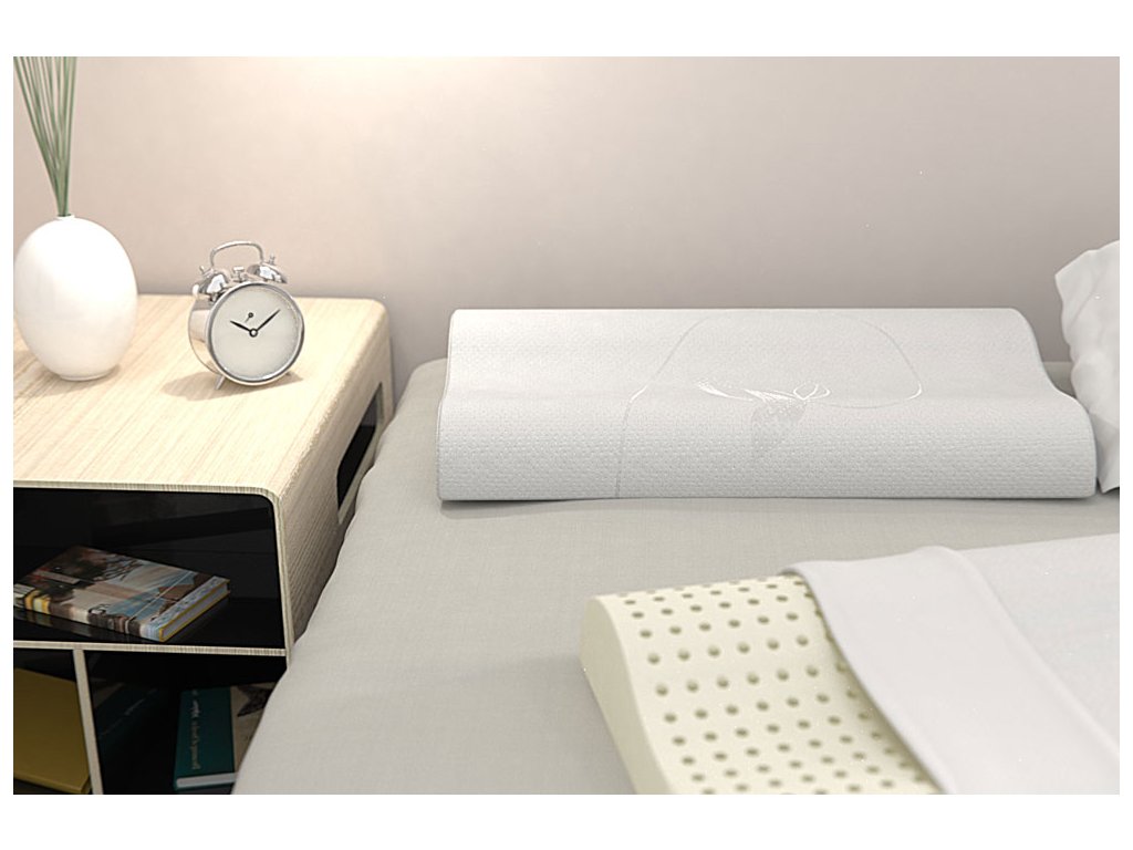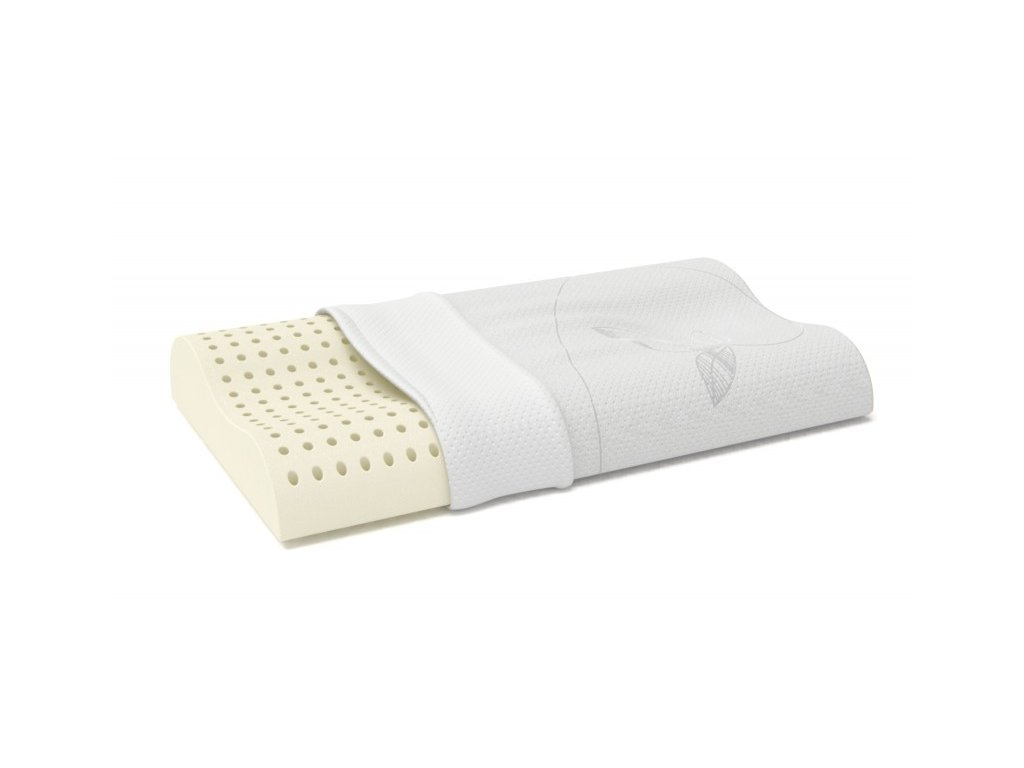 Anatomický polštář vyrobený z "perforované latexové pěny". Je velmi komfortní a poskytuje perfektní opěru krční páteře.