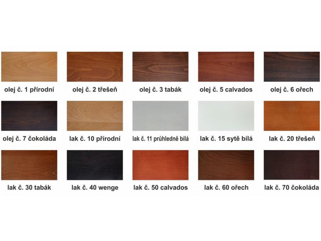 Za příplatek odstíny olej č. 2, 3, 5, 6, 7, dále vodou ředitelný lak 10.